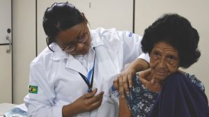 Técnica do Centro Madre Teresa de Calcutá vacina moradora da Ilha